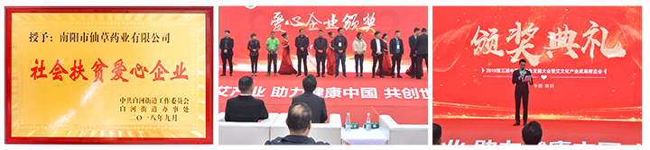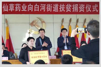 公司为白河街道贫困户捐助30万元,做为股金入股企业,年分红利3万元,由街道办事处为贫困户购买公益性岗位和做为贫困户收益,为贫困户提供更加有效的就业保障。提高贫困户收入。2018年10月16日举行隆重的授牌仪式,会上市领导对南阳仙草药业有限公司的扶贫工作给予高度赞场和肯定,并鼓励其他企业向仙草药业学习。